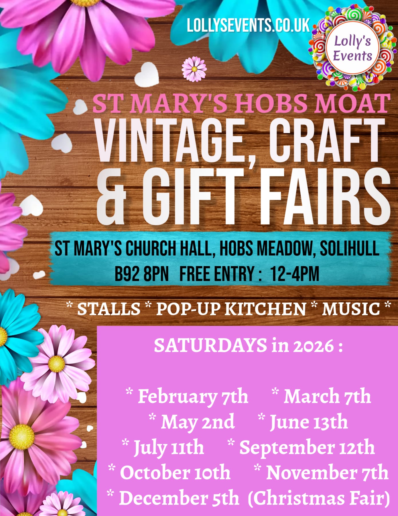 Lily & Lolly’s Ultimate Vintage & Craft Fayres with music, pop-up tea parlour, and a fabulous selection of craft stalls, vintage collectibles, handmade items, clothing and local small businesses showcasing their wares.